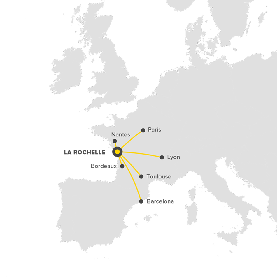 Paris: 467 km / Lyon: 650 km / Toulouse: 400 km / Bordeaux : 190 km / Nantes: 146 km / Marseille: 825 km